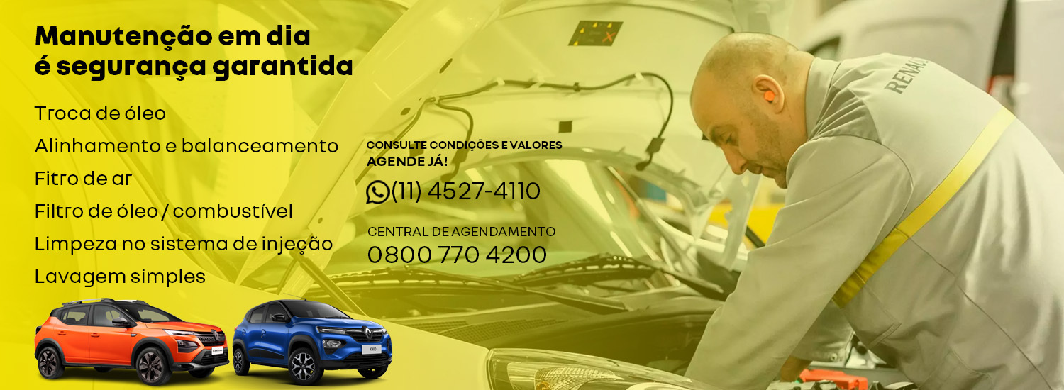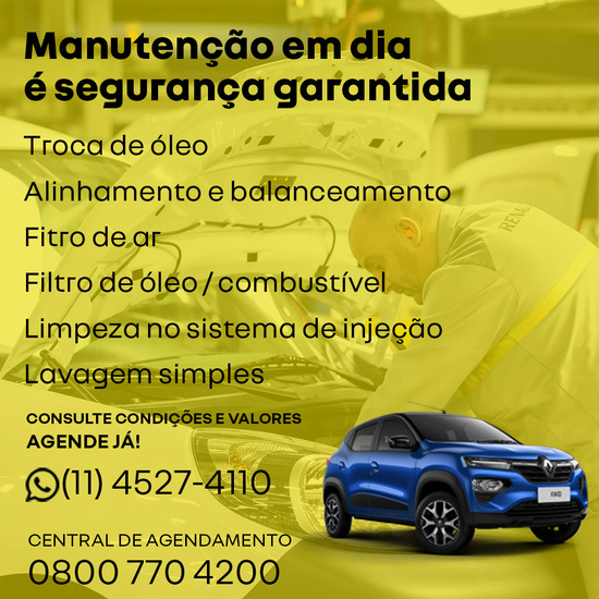 Os serviços de pós-venda da Renault combinam confiabilidade, qualidade e transparência. Nosso time é altamente treinado para cuidar do seu veículo com peças originais e dentro dos padrões da marca. Com atendimento transparente, garantimos a melhor experiência para você e seu Renault.